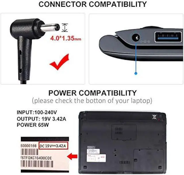 Output: DC 19V- 3.42A. 65W compatible with 45W 19V 2.37A charger via 4.0 * 1.35 mm tip
