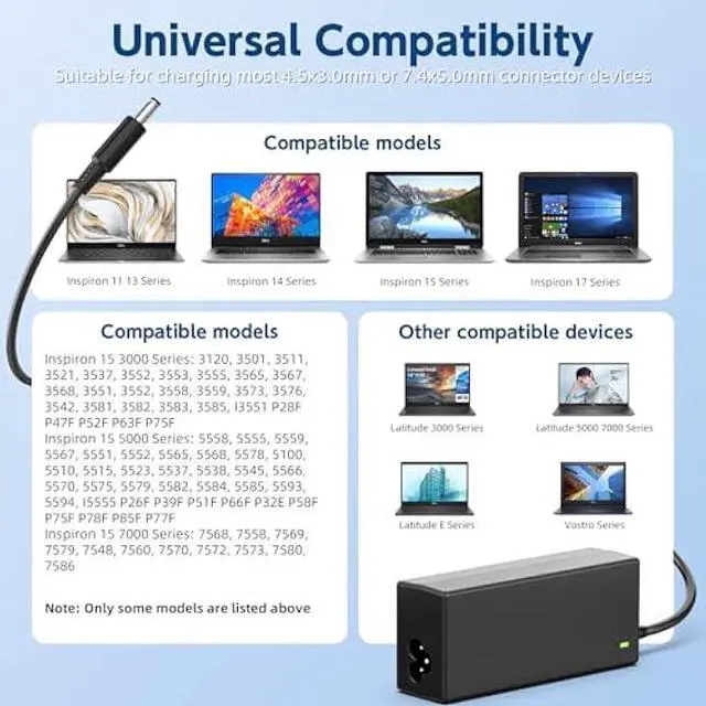 ROLADA Power Cord Compatible with Dell Inspiron 15 17:15 3000/5000/7000 Series 3555, 3565, 3567, 3568, 3551, 3552, 3558, 3559, 3573, 3576, 3581, 3582, 3583, 5100, 5570, 5566, 5578, 5551, 5552, 5555, 5558, 5559, 5565, 5567, 5568, 5575, 5579, 5582, 5584, 5585, 7579, 7560, 7558, 7568, 7569, 7572, 7570, 7573, 7580, 7586; 17 5000/7000 Series 5755, 5758, 5759, 5767, 5765, 5775, 7778, 7779, 7779, 7773, 7786 Laptop Power Adapter