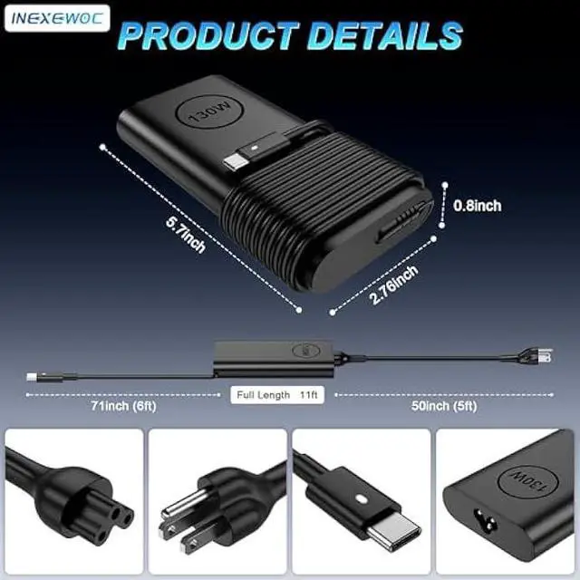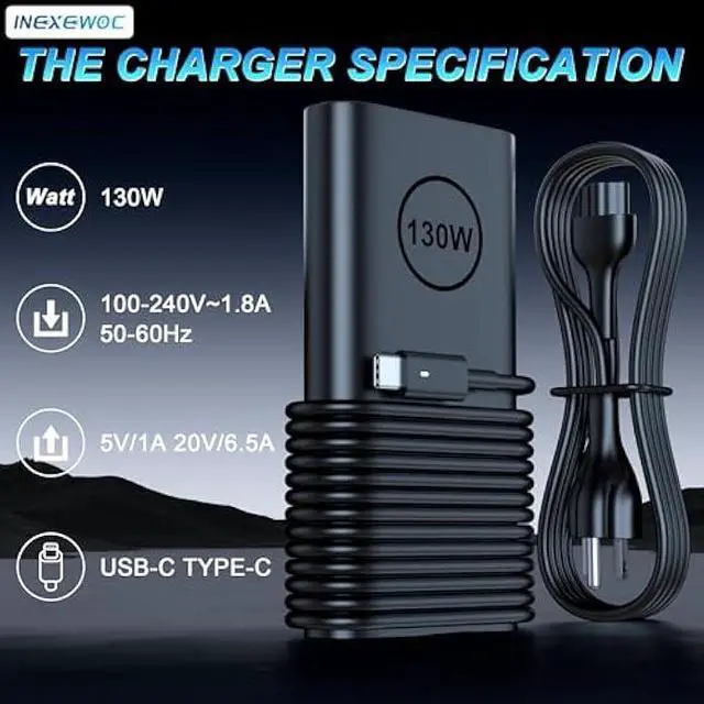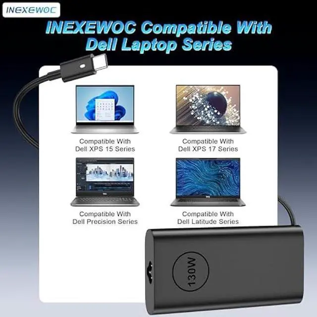 INEXEWOC 130W USB C Laptop Charger Compatible with Dell 130W XPS 15 9575 2-in-1 9500, XPS 17 9700 9710; Precision 3470 3541 3550 3551 3560 3561 3570 3571 5470 5550 5560 5570 5750 5760 5770 5530 2in1, Latitude 9410 7410 7310 7210 5520 5511 5510 5420 5411 5410 5400 5320 5310 and more