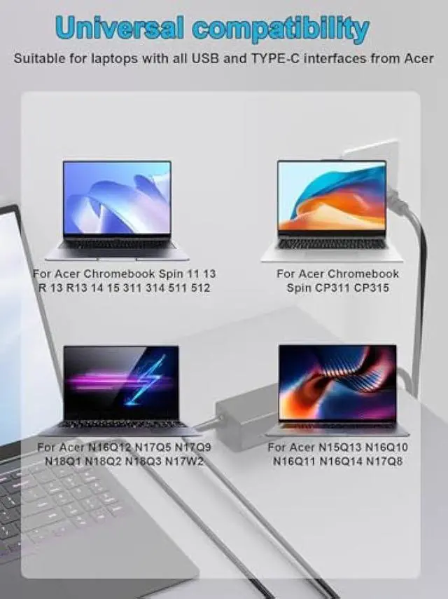 HSXIRQA Fit For Acer Chromebook Spin 15.6 15 CP315 CP315-1H CP315-1HT Chromebook Plus 15.6 515 CB515-2H CB515-2HT Chromebook 15.6 515 CB515-1W CB515-1WT CB515-1H CB515-1HT Chromebook 15 315 CB315-1H CB315-1HT CB315-2H CB315-2HT CB315-3H CB315-3HT CB315-4H CB315-4HT Chromebook 15.6 715 CB715 CB715-1W CB715-1WT Chromebook 16 516 GE CBG516-1H Touchscreen Laptop Computer USB Type C Power Supply Adapter Cord