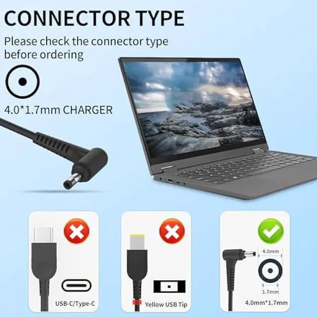 Connecter diameter: Round Tip 4.0 mm* 1.7 mm, Please check the connector and refer the picture. The charger cord is approximately 5.5 feet long