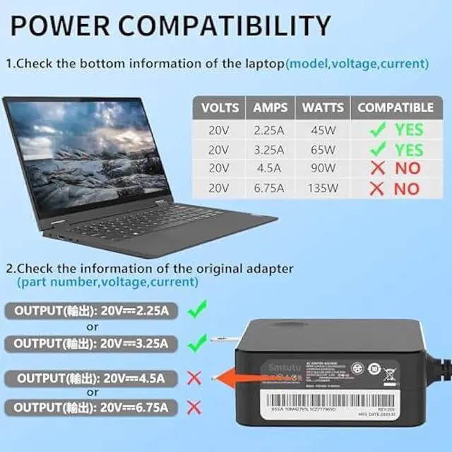Output: 20V 3.25A 65W; Compatible with 20V 2.25A 45W;