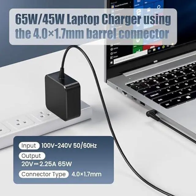 Universal Voltage & Fast ChargingSupports 100V240V input, 20V 3.25A / 20V 2.25A / 19V 3.42A output, suitable for both 65W and 45W devices using 4.0 × 1.7 mm DC plug.