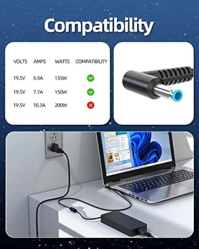 output: 19.5V ~ 7.7A 150W (150 Watt compatible with 120W 135W), Connectors: 4.5 mm x 3.0 mmnot compatible with 180W 200W