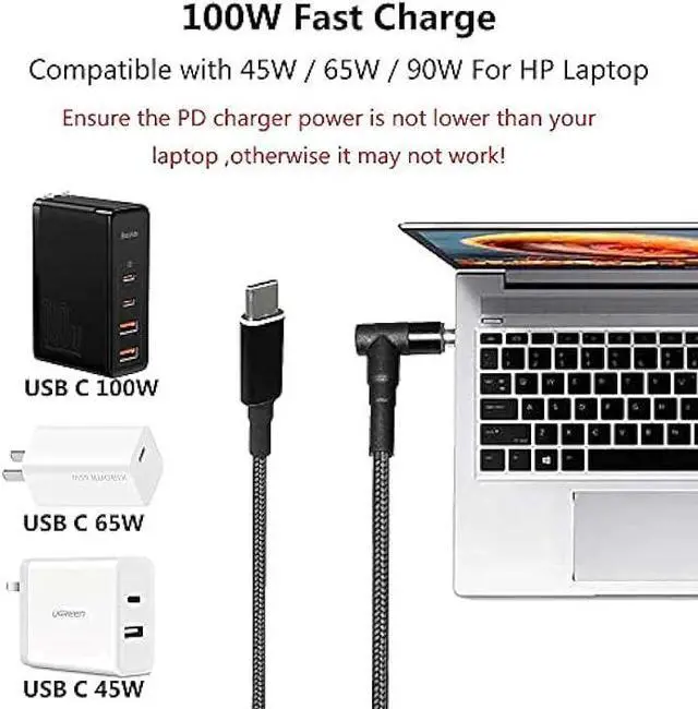 Type C Cable for HP Laptop - Durable braided nylon wrapped shell and reinforced joint provide long-lasting lifespan and tangle-free using experience which is better than others. Please note that the power of your PD wall charger must be over than the laptop output for e. g., the original power supply of your laptop is 19V 3.33A, and its power is 65w, then you need to use a 65W PD power supply for this cable.