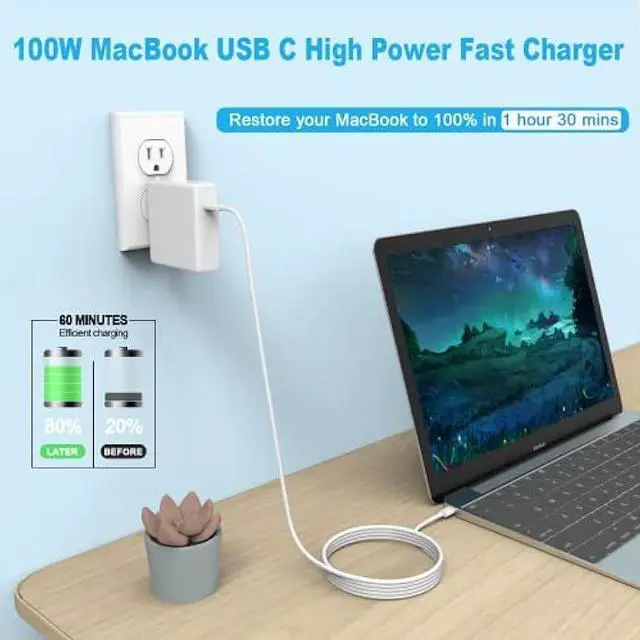 Super Fast Charger100W USB-C power adapter with 96% charging efficiency, our macbook air charger delivers fast and steady current, the charger can fully charge most laptops in about 1 hour and 30 minutes. It can charge most cell phones from 0% to 80% in less than 20 minutes. With our macbook pro chargers, you can charge quickly and efficiently at home, in the office or on the go, solving all your charging problems