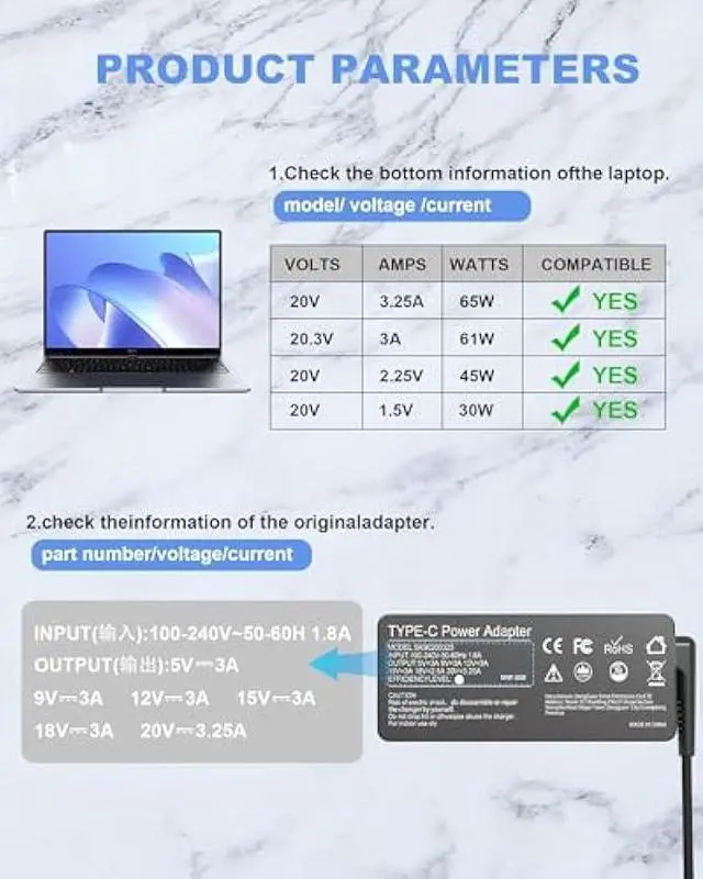 Output Max: 65w ~ 20v 3.25 a Compatible 45W~ 20v 2.25 a/and Less Than 65W