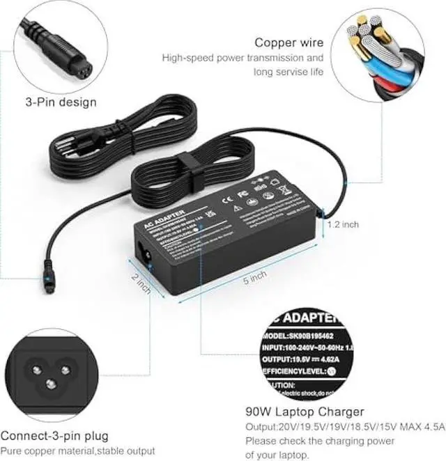 Input: 100-240V 50-60Hz, Output: DC 15V 16V 19V 19.5V 20V, Perfectly Compatible with 90W 75W 70W 65W 45W 40W 33W Laptops, Support 2.25A 2.31A 2.37A 3.25A 3.33A 3.34A 3.42A 3.5A 4.5A 4.62A 4.74A Current. Anything within 90W can be compatible and replaced. supports fast charging.