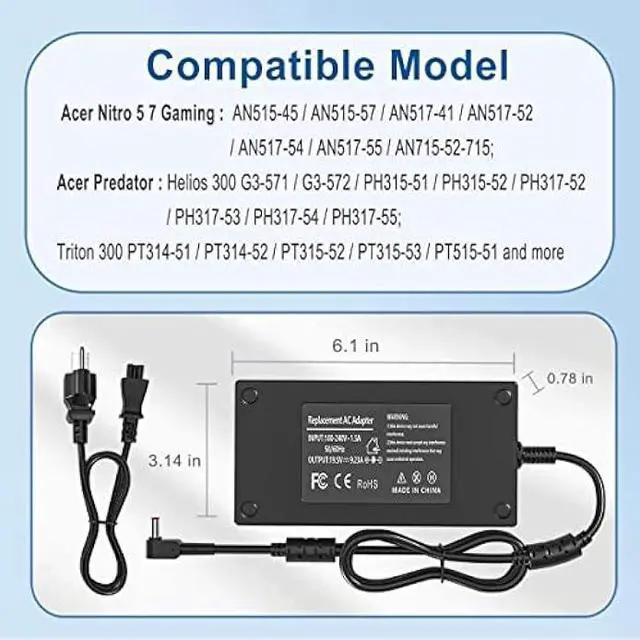 This BURFLO Laptop Charger Compatible with AN517-41-R0RZ / AN517-41-R7FP / AN517-52 / AN517-52-77DS / AN517-55 / AN517-54 / AN517-54-79L1 / AN715-51-752B; Predator Helios 300 G3-571 / G3-572 / G3-571-77QK / G3-571-51NK / PH315-51 / PH315-52 / PH317-51 / PH317-52 / PH317-53 / PH317-54 / PH317-55; 300 PT314-51 / PT314-52 / PT315-52 / PT315-53