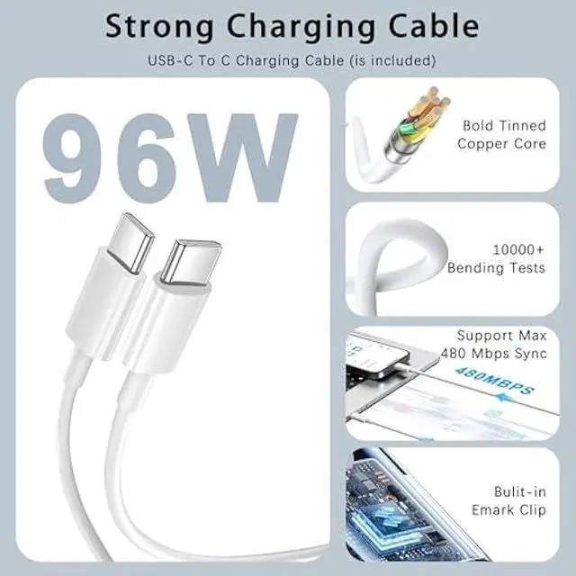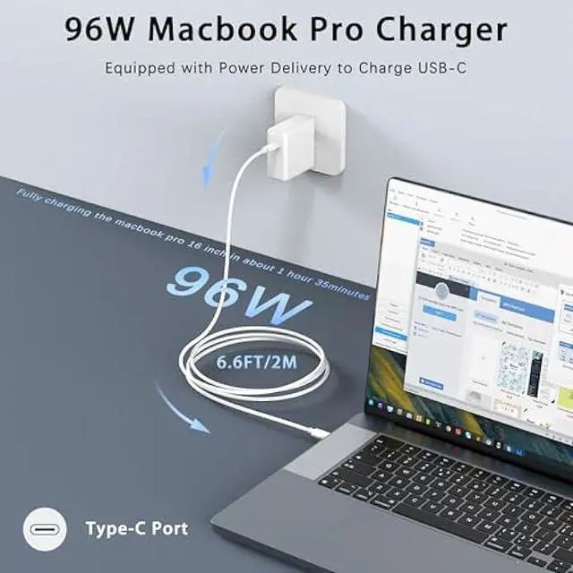 What's in package: 1 Pack 96 Watt Wall Charger; 1 x 6.6FT Type C to C Cable; 1 x Instruction for Macbook Pro Charger