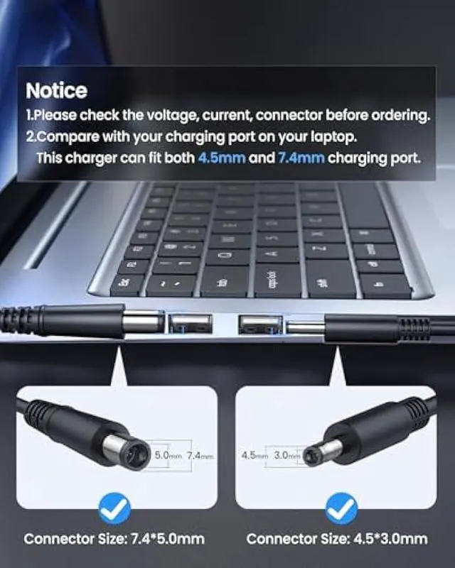 - Output: 19.5V 4.62A 90W, Input: 100~240V / 50-60Hz, Connector: 4.5 mm* 3.0 mm Round tip (Including a 4.5 mm to 7.4 mm converter tip for more charging needs)