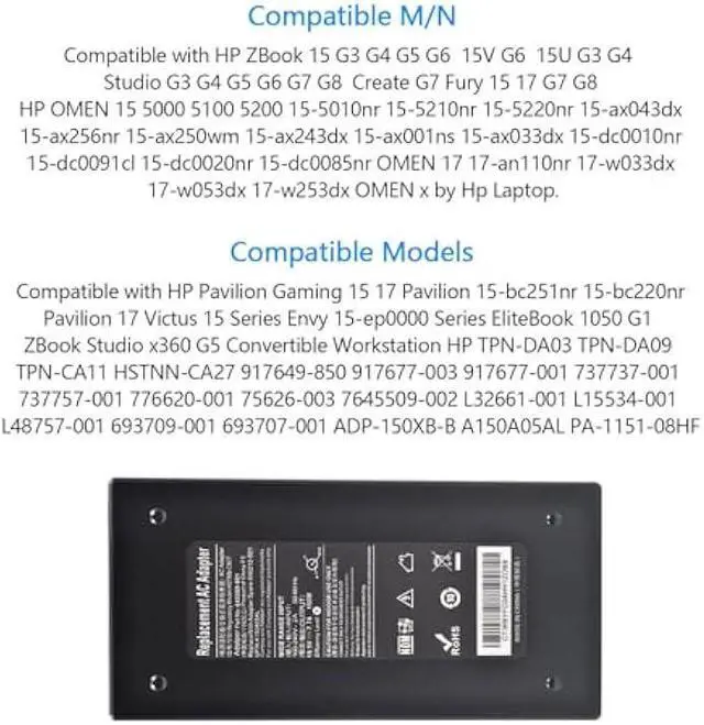 COMPATIBLE MODELS: Compatible with HP Pavilion Gaming 15 17, Pavilion 15-bc251nr 15-bc220nr, Pavilion 17, Victus 15 Series, Envy 15-ep0000 Series, EliteBook 1050 G1, ZBook Studio x360 G5 Convertible Workstation, HP TPN-DA03 TPN-DA09 TPN-CA11 HSTNN-CA27 917649-850 917677-003 917677-001 737737-001 737757-001 776620-001 75626-003 7645509-002 L32661-001 L15534-001 L48757-001 693709-001 693707-001 ADP-150XB-B A150A05AL PA-1151-08HF