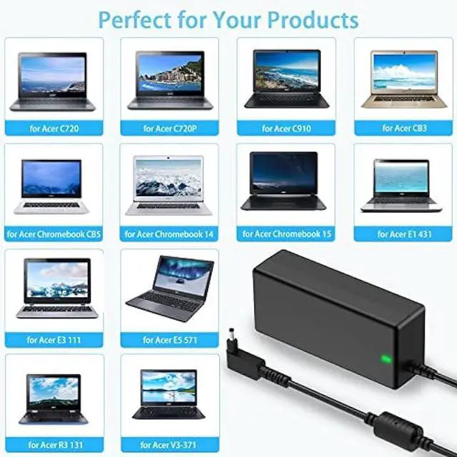 Compatible with Acer Aspire 1 5 R5 R7 A515-54 R5-571T R5-571TG V3-372T R7-371T A115-31 R5-471T V3-372; Swift 1 3 SF314-52 SF314-51 SF113-31; Spin 1 3 5 SP111-31 SP111-33 SP111-32N; Iconia W700P W700; Acer Aspire Switch 10 Charger SW3-013 SW5-011 SW5-012 and more series. (NOTE: Please check the model number before you place order! Our compatible model list is not complete, if you can not find your laptop model in it please contact us )