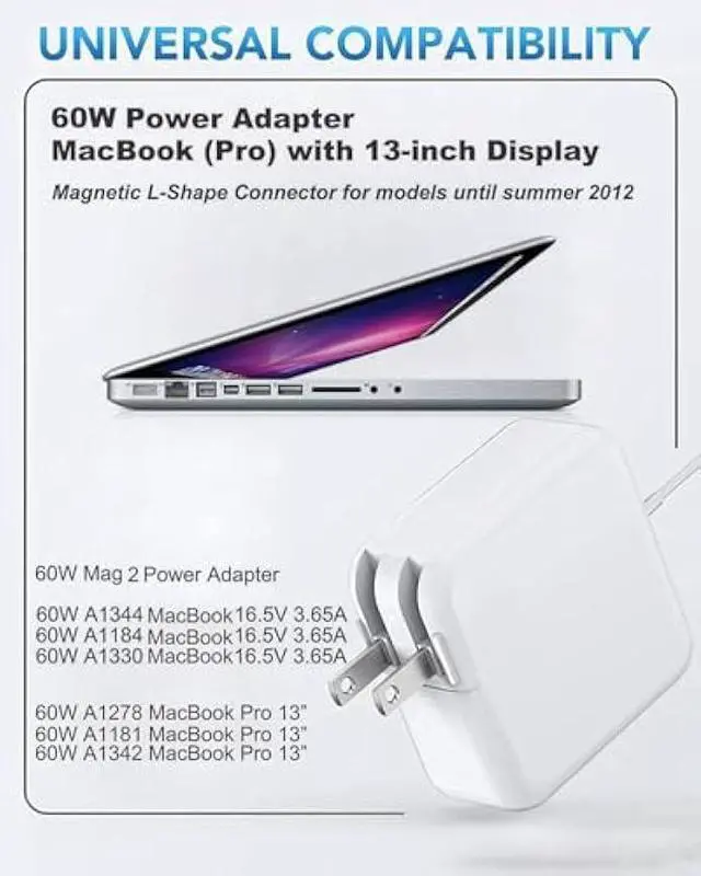 Compatible with Mac Book laptops: Suitable for laptop power supply models: A1425, A1435, A1502, A1466, A1436, A1465. Compatible with Mac book