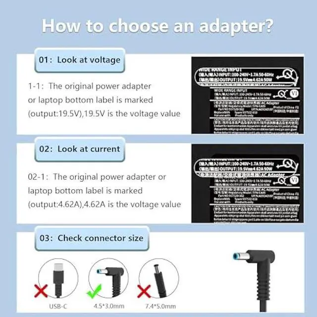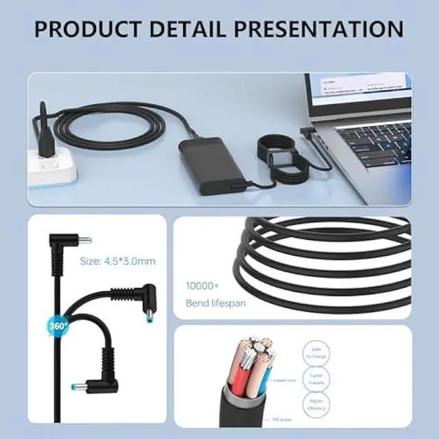 Max Output: 19.5V 4.62A 90W laptop charger; connector size: 4.5 * 3.0 mm blue tip (compatible with hp laptop charger 65w blue tip)