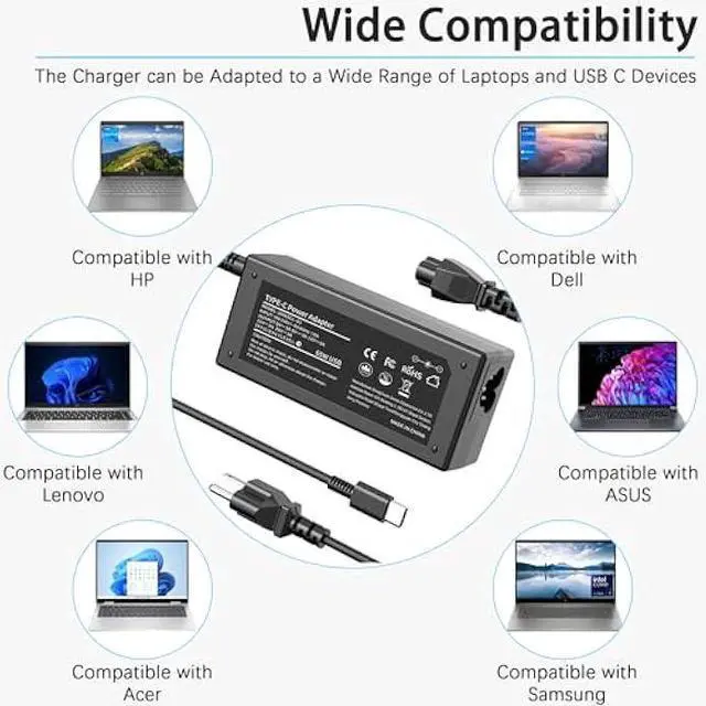 VAGITTO Compatibility-USB C laptop charger 65W is also compatible with 45W 36W. Universal 65 watt laptop charger also replacement for Dell USB C charger, charger for HP Chromebook, Len ovo Computer Charger, Asus Chromebook charger, Acer Chromebook computer charger, Sam sung laptop charger type c, Google Chromebook charger