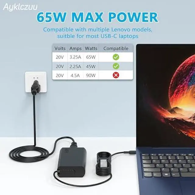 AYKLCZUU 65W USB C Charger Compatible with Lenovo Thinkpad Charger. ThinkPad T14 T14s T15 T16 L13 L15 L14 X13 E14 E15 E16 Gen5 Gen6 Gen4 Gen3 Gen2 Gen1, ThinkPad X1 Carbon Gen12 Gen11 Gen10 Gen9 Gen8 Gen7 Gen6, ThinkPad T480 T480s T490 T490s T495s T580 T580s T590 T495S L380 L390 L480 L490 E480 E485 E490, ThinkBook 15 14/X1 Laptop Ac Adapter