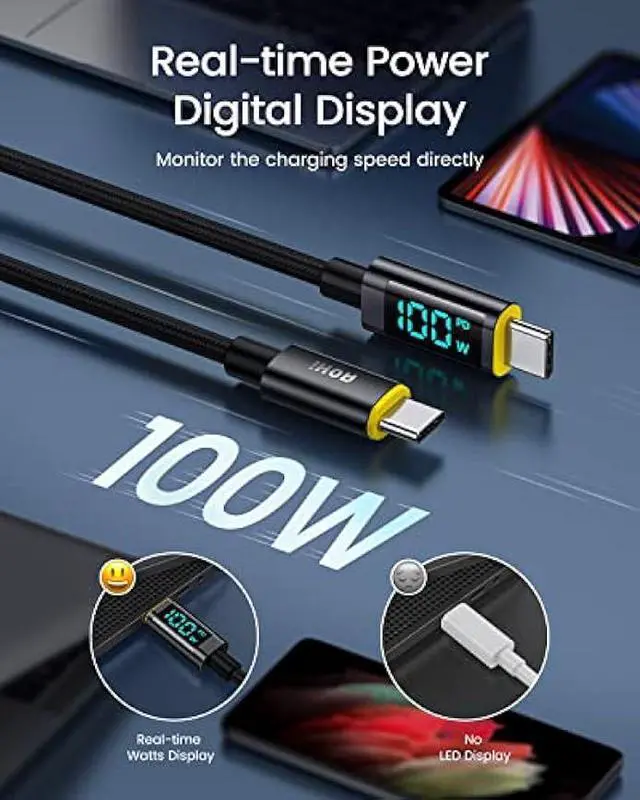 4ft USB C to USB C LED Display Cable Included. Our 100W USB C charger comes with a 4ft 100W USB C to USB C LED digital display cable to offer you an unparalleled visible charging experience. Equipped with E-Marker chipset for faster and safer charging, this cable features a cool LED digital screen to monitor real-time power and charging speed, and supports up to 5A, 100W PD fast charging and 480 Mbps data transfer speed