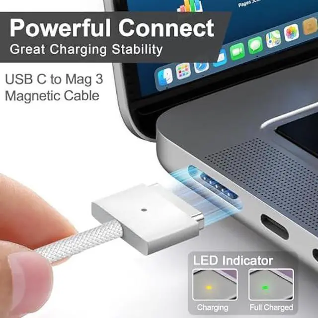 Magnetic Connector LED Indicator: The 140W power adapter features a magnetic connector to ensure harmless disconnection of the cord if it experiences excessive strain, helping to prevent the cable from fraying or weakening. Plus, the magnetism helps guide the plug into the system for quick and secure connections. LED lights provide status information, an amber light lets you know your charger is charging, and a green light shows you're fully charged.