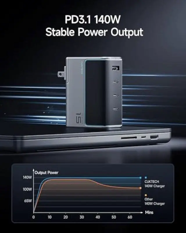 PD 3.1 140W ChargerUltra-Fast ChargingUnlock lightning-fast charging with the PD 3.1 140W charger, designed to power up your devices in record time. It can charge your MacBook Pro 16 M3 Pro to about 55% in just 30 minutes. Whether you're working on-the-go or at home, this charger delivers ultra-efficient power, designed for your fast-paced life.