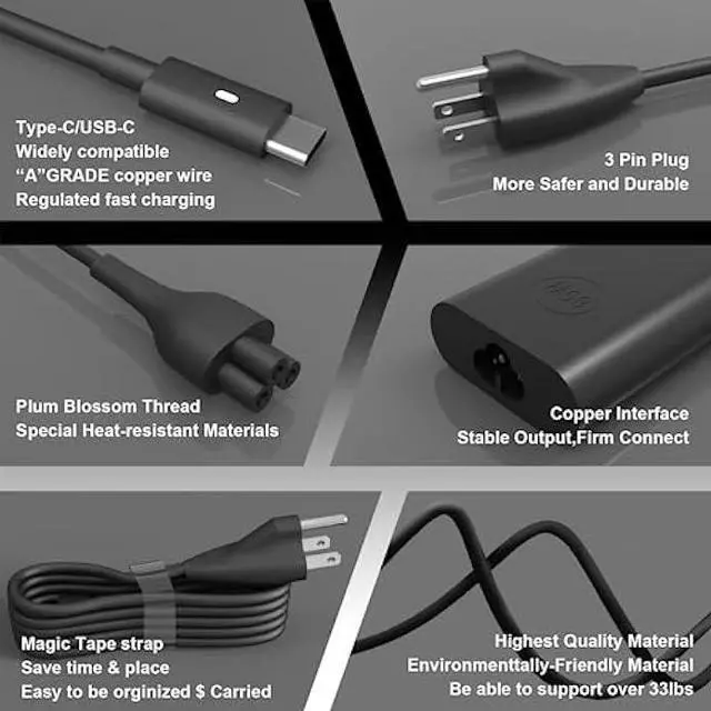 Watt: 65.0W (Compatible with 45 Watt ) Output5V-3A 9V-3A 12V- 3A 15V-3A 18V- 2.5A 20V- 3.25A USB Type-C(USB-C)Laptop Charger.