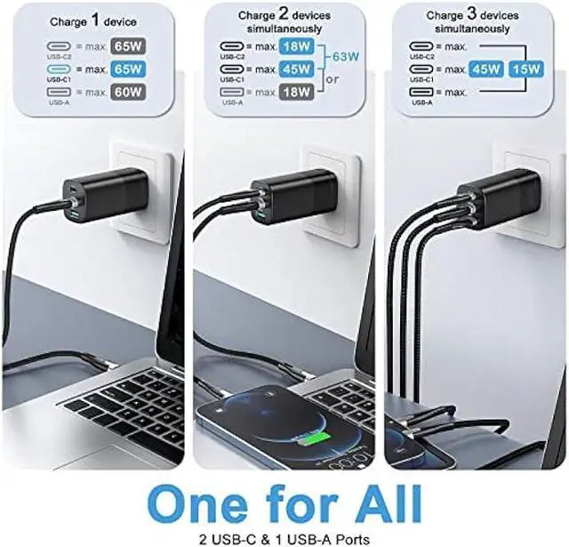 65W USBC dual-port blind plugThe USB-C1 and USB-C2 ports can reach 65W when used alone, which means that if you only need to use one USBC port, you can plug into any USBC port at will. Many three-port GaN charger USB-C2 on the market can only reach 30W when used alone.