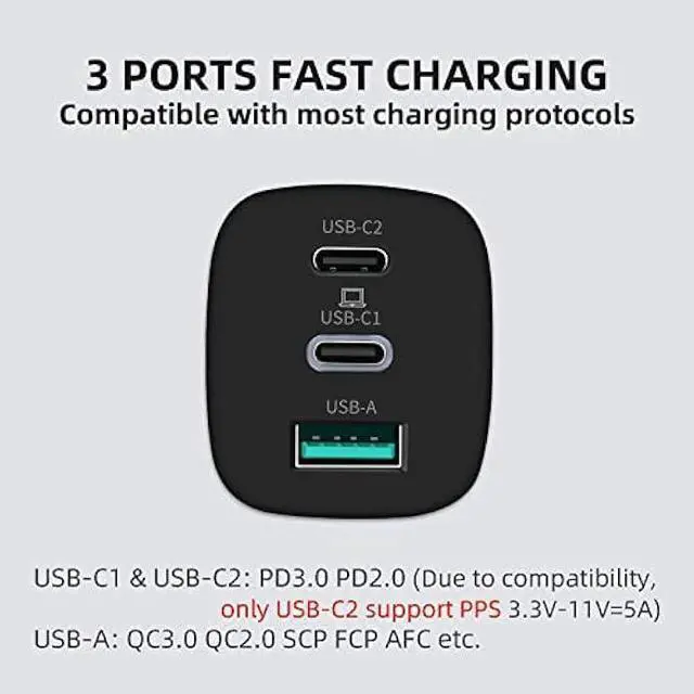 Multi-Protocol Support USB-C1 support PD 3.0 PD 2.0, USB-C2 support PD 3.0 PD 2.0 PPS (Due to compatibility considerations, only USB-C2 supports PPS 3.3V -11V=5A). USB-A port surpport QC 3.0 QC 2.0 SCP FCP AFC etc. This charger is compatible with most USB-C phones, tablets, laptops. Like Samsung Galaxy Series, iPhone Series, Pixel Series etc, Surface Series, Macbook Series, iPad Series.