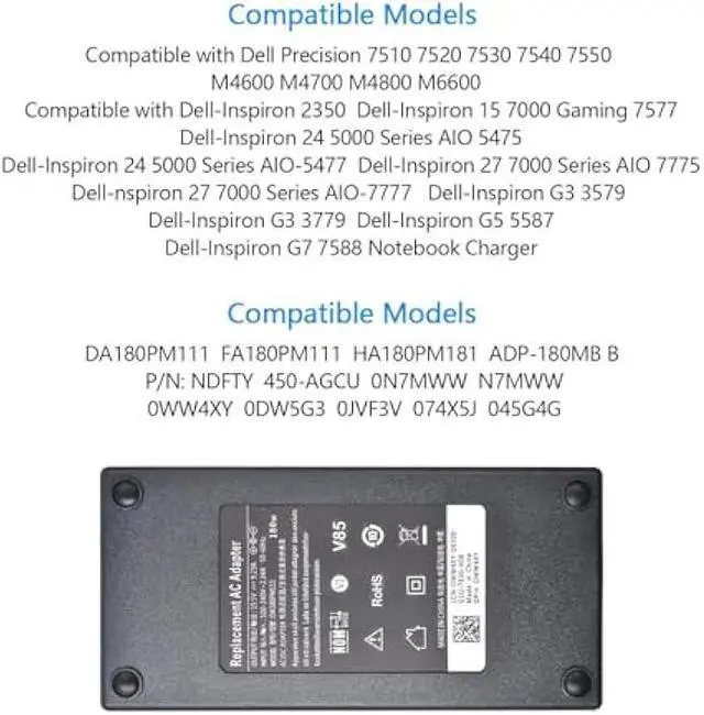 COMPATIBLE MODELS: Compatible with Dell Precision 7510 7520 7530 7540 7550 M4600 M4700 M4800 M6600; Compatible with Dell-Inspiron 2350, Dell-Inspiron 15 7000 Gaming 7577, Dell-Inspiron 24 5000 Series AIO 5475, Dell-Inspiron 24 5000 Series AIO-5477, Dell-Inspiron 27 7000 Series AIO 7775, Dell-nspiron 27 7000 Series AIO-7777, Dell-Inspiron G3 3579, Dell-Inspiron G3 3779, Dell-Inspiron G5 5587, Dell-Inspiron G7 7588 Notebook Charger