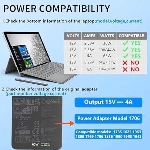 Compatible with Microsoft Surface perfect match surface model 1706, 1866, 1796, 1769, 1724, 1625, 1867, 1735, 1800 and so on, higher charging performance than 44W, 39W, 36W, 24W laptop / tablet charger