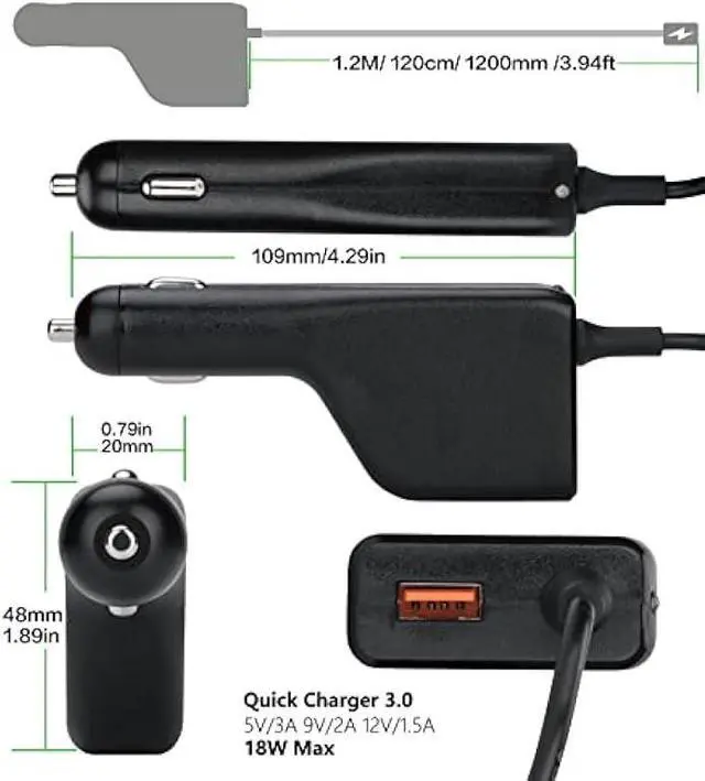 Connector size: ø 4.5 * 3.0 mm (Blue Connector), Output 19.5V 4.62A (aslo compatible with 3.33A and 2.31A ).. works with the 12V-24V cigarette lighter