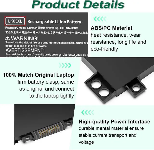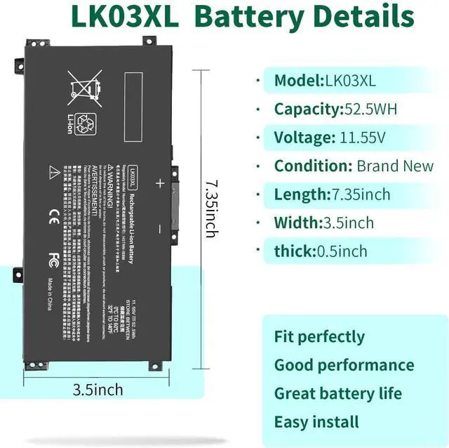 Our LK03XL Battery is highly compatible with the original LK03XL HP Battery and meets CE/FCC/ROHS/UL certified standards. It is a brand-new product from the manufacturer and supports up to 1000 recharge cycles
