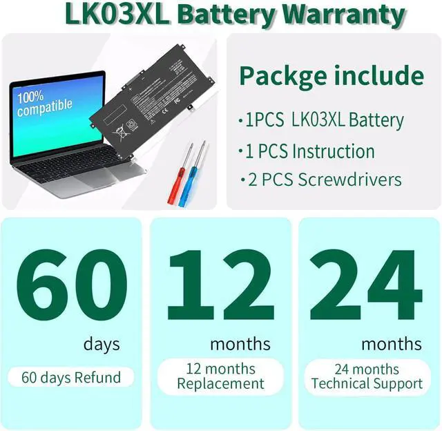includes: 1x LK03XL Battery, 2 x Screwdrivers, 1x Instruction for LK03XL Laptop Battery