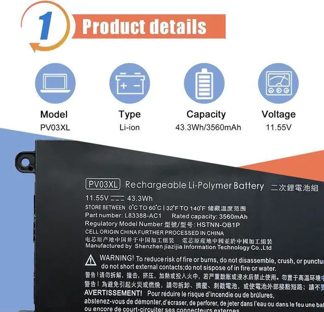 Compatible P/NPV03XL/ PP03XL/ L83388-AC1/ L83393-005/ L83388-421/ M01148-421/ M01118-AC1/ HSTNN-LB8S/ M01144-005/ M01148-421/ / HSTNN-DB9X/ HSTNN-OB1P/PPO3XL/ PVO3XL, 3ICP/5/68/73