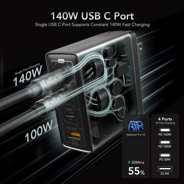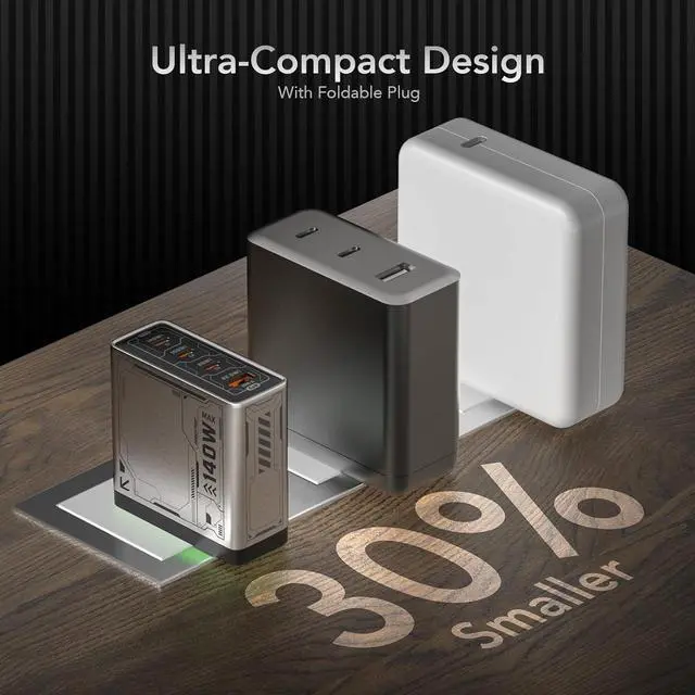 Ultra Portability: Revolutionary GaN technology + foldable plug shrinks size by 30% vs. original 140W fast chargers. Its perfect for travel work or on-the-go charging without sacrificing power4-in-1 Multiport