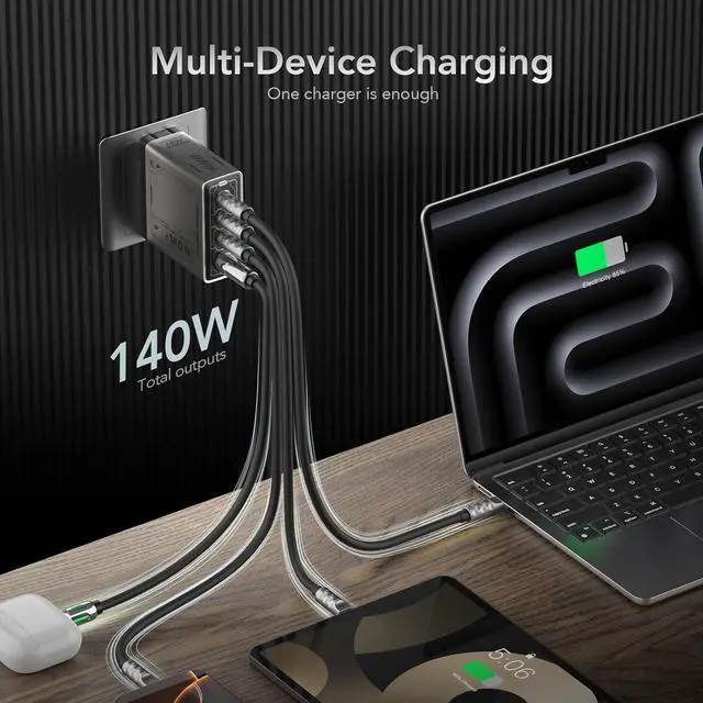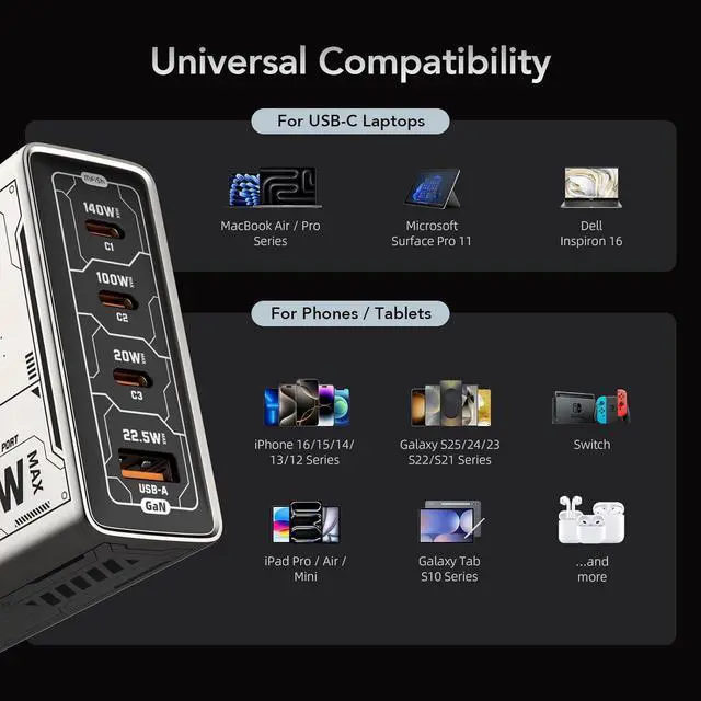 Compatibility: Mfish140W Charger is compatible with MacBook Pro 16 15 14 13 MacBook Air XPS 15/13 HP Spectre/HP Chromebook iPad Pro iPhone 17/16/15 Pro/14 Pro Max/13/12 Galaxy S23 Ultra/S22 Switch Steam Deck and More; laptop series cannot be charged at full speed due to charging protocol restrictions