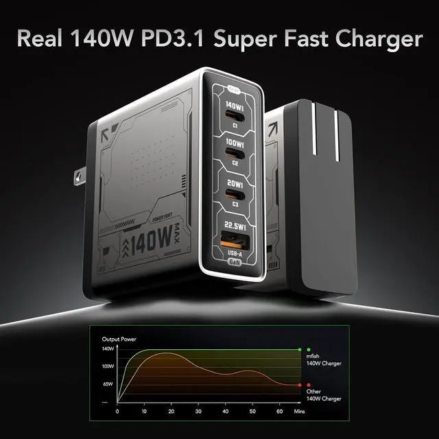 Temperature Control Tech: Equipped with Mfish-ICE 2.0 technology Mfish 140W fast charger has passed 1 070 000 full power overload tests supports high power output while real-time temperature control and rapid heat dissipation safeguarding your devices from overheatingUniversal