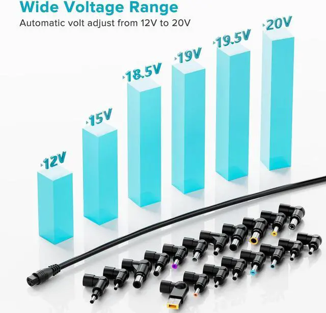 A Fantastic Space Saver: ZOZO Universal Laptop Charger 90W Laptop adapter with 17 pcs Tips works with most laptops chromebooks ultrabooks. Power your different brand laptops with one laptop power cord. This laptop charger & adapter replacing 90W 75W 65W 45W laptop AC Adapter computer cord from 12 volt to 20 volt computer charger. Does not include USB C plug. Please check and confirm that your laptop power plug type is included in our plug list before purchasingWIDE OUTPUT VOLTAGE 12V-20V -