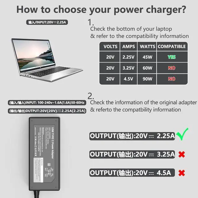 : Connector Type USB Type-C Wattage 45W Output 5V-3A or 9V-3A or 15V-3A or 20V- 2.25A