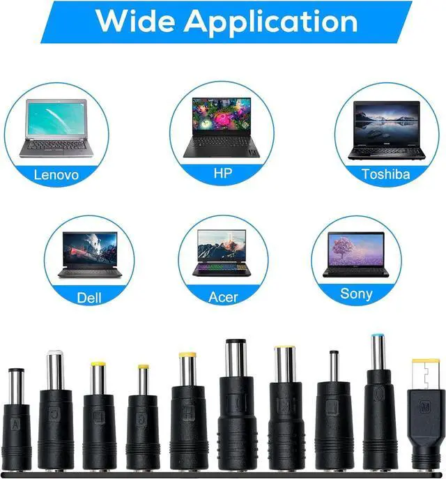 jack plug and compatible with 100W 90W 65W 45W 30W 18W etc. power delivery PD rapid charge ( Not for video or data transferring use ) Wide UseUSB C to DC Adapters 10 Sets Power Plug Kit is a combination of USB Type C to DC power cable and universal DC connector which can be compatible with UPS ONT router printer projector and Sony Toshiba BenQ Fujitsu MSI Compaq ideapad/Thinkpad IBM HP and other 100w 90w 65w 45w computer models. Detailed models please check your original charging port & power supply. Portable TravelTravel friendly with lightweight & compact portable design that you can get rid of the heavy chargers / power bricks to save your precious packaging space.
