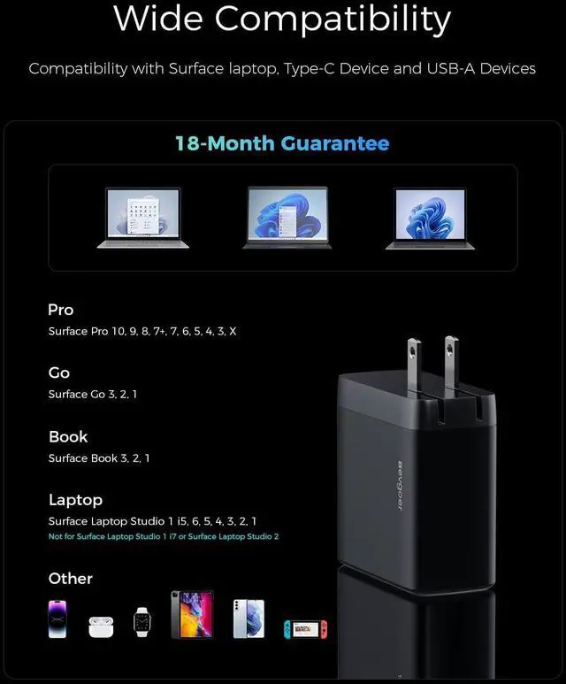 (18-Month Guarantee)2-in-1 Charging Solution: This charger is compatible with both Microsoft Surface laptops/tablets (via included Surface connector) and USB-C devices like smartphones earbuds and gaming consoles. Simply attach the magnetic Surface connector for your device or use it as a standalone USB-C charger.