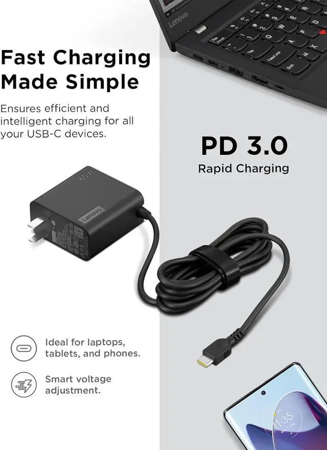 [PORTABLE CHARGING] Slim light design and extra-long 1.7 m ( 5.9 ft) cable lets you charge in any spot making powering up more convenient. [FAST CHARGING] with PD 3.0 this adapter can rapid charge your device at an astonishing 65W - perfect when you need that extra boost of energy on the fly. [USB-C COMPATIBILITY] Charges a wide range of USB-C devices. You can quickly charge your laptop or mobile device without hassle.