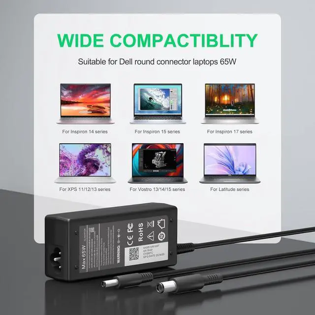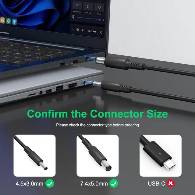 Connector size: 4.5 mm x 3.0 mm and 7.5 x 5.0 mm (Note: Please make sure the output and tip size of ac adapter are accordant before you buy)CHARGER COMPATIBILITYCompatible With 11 13 15 17 Series13 7348 7353 7359; 14 7000 7437; 14 3451 i3451 3452 3458; 15 3551 i3551 3552 3558; 15-5000 Series 5552 5555 i5555 5558 i5558 5559; 15 7558 i7558 7568; 17 5758 5759COMPATIBLE WITH P/NP/N OKXTTW MGJN9 332-1827 312-1307 332-0971 SK90195334 S2415HB HA65NS5-00 4C7N4 JT9DM 0CDF57 00285K 04H6VH DA65NS0-00 DPW2X DPW2X 0YTFJC-48661 M1P9J RWHHR Y1H45 D0KFY 5NW44 492-BBOF 03RG0T PA-1450-66D1 LA65NS2-00 CC0DT RFRWK 0JHJX0 04H6NVSAFETY PROTECTIONOur products are in compliance with top charger industry standards over-current over-voltage and short-circuit protection effectively protect your devices from damage. Ensure the safety during the using. It is safer than other chargersWHAT YOU GET1 x 65W Laptop Charger with 4.5 x 3.0 mm + 7.4 x 5.0 mm Connectseach product has been rigorously tested for performance against overvoltage and short circuit protection. Any questions please feel free to contact us