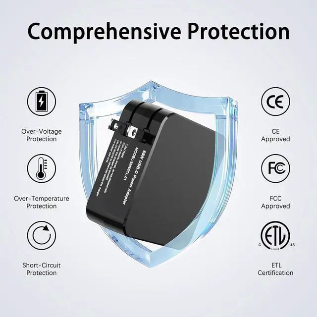 & Certified Protection: 65W USB-C laptop charger are CE/FCC certified meeting safety and quality standards. 65W USB C Power Adapter features an intelligent chip with multi-protection systems including over-current over-voltage over-temperature short-circuit and over-charging protection. USB C Fast Charger ensures secure stable charging and safeguards your devices. It is an ideal choice for reliable power supplyPackage1x AC adapter & 1x AC power cable.