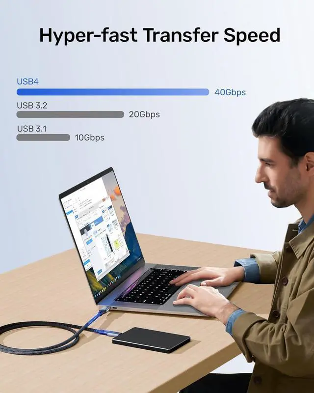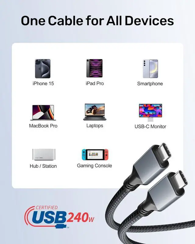 40Gbps Data TransferAGFINEST USB C to USB C Cable supports 40Gbps* high-speed transmission allowing you to move photos 4K videos and large projects in seconds. (*Speeds vary by devices) 240W Fast ChargingWith PD 240W fast charging this USB4 for Thunderbolt cable ensures your devices are charged quickly and efficiently. Say goodbye to long charging times and keep your devices powered up on the go. 8K@60Hz ResolutionExperience stunning 8K@60Hz or 4K@144Hz audio and video synchronization with this video cable. It's ideal for high-resolution displays and professional video editing. Multi-Screen ExpansionPerfect for professionals and gamers alike this USB4 data cable supports multi-screen expansion.