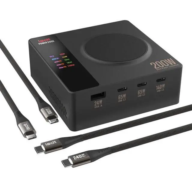Enough: Type-C + USB A + Wireless MagSafe Magnetic Charging 200W Ultra-High-Power ISDT POWER200 charger supports a maximum output power of USB-C1C265W USB-C3140W 24W on 1 USB A port and 15W wireless magsafe magnetic charging. The powerful Adapter can quickly charge 5 devices at the same time. Make your desk neatly. Adapters wires and devices do not mess up any more free you up a comfortable office space. PD 3.1 multiple device charger stationREAL Independent Quick Charging PD 3.1 quick charge protocol is supported. With 200w total output this Charger charges 5 devices simultaneously with their full speed. Each charging output interface is independent of each other and charging multiple devices at the same time will not cause frequency reduction let you really enjoy the fast charging technology.