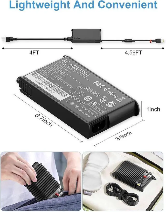 Watt: 230W230W Laptop Charger Compatible with Legion 5 Laptop 14APH8 16IRH8 16AHP9 16APH8 16ARP9 Legion Slim 7 16IRH8 16APH8 Legion 5 15IRX9 15APH9 15ARP8 15ARH05 15IMH05 15ARH05H 15IMH05H 15IAH7 15IAH7H 15ARH7H 15ARH7 15IMH6 15ITH6 15ITH6H 15ACH6 15ACH6A 15ACH6H 16IRX9 Legion 5-17IMH05H 17IMH05 17ITH6H 17ITH6 17ACH6 17ACH6H 17ARH05H Legion 7-15IMH05 16IRX9 15IMHg05 Legion 5P-15IMH05 15ARH05H 15IMH05H Legion S7-15IMH5 15ARH5 15ACH6 Legion S7-16IAH7 16APH8 16ARHA7 16IRH8 Legion C7-15IMH05 LOQ 15 16 inch Laptop230W Laptop Charger Compatible with Legion Y920-17IKB Legion Y740-15ICHg Y740-15IRH Y740-15IRHg Y740-17ICHg Y740-17IRH Y740-17IRHg Legion Y730-15ICH Y730-17ICH Legion Y720-15IKB Legion Y545-PG0 Legion Y540-15IRH Y540-15IRH-PG0 Y540-17IRH Y540-17IRH-PG0 Legion Y530-15ICH Y530-15ICH-1060 Legion Y520-15IKBA Y520-15IKBM Y520-15IKBN Legion R720-15IKB R720-15IKBN Legion Y7000-2019 ideapad Y910-17ISK Y900-17ISK ThinkBook 16p NX G2 G3 ARH G4 G5 ACH ARH IRH IRX Y7000P G5000 Laptop Yoga A940-27ICB All-in-OneThe laptop charger port output up to 230W power delivery enables fast and efficient charging of compatible devices;