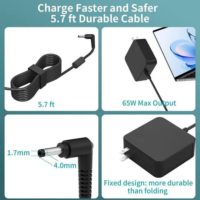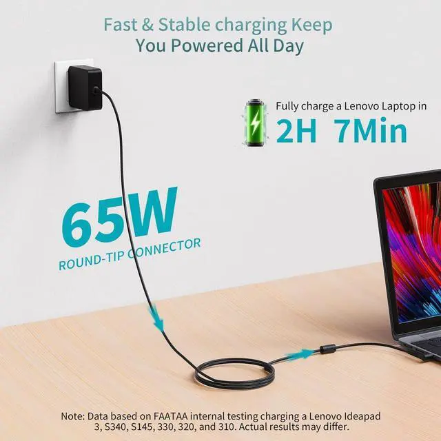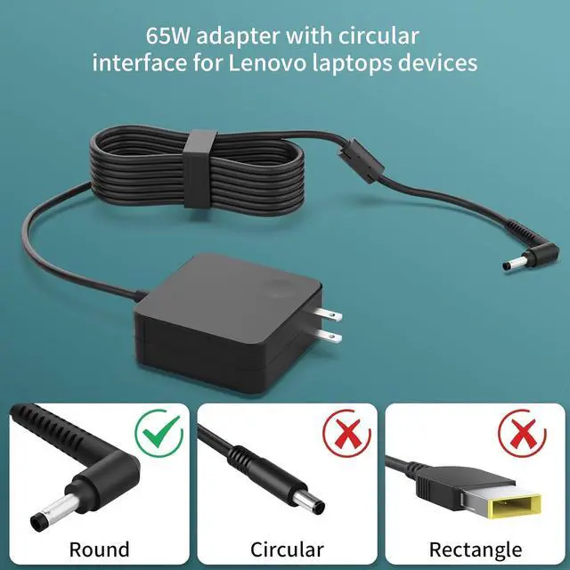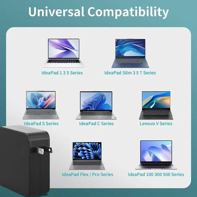 65W Laptop Charger Compatible with This high-efficiency AC adapter delivers stable 20V/ 3.25A (65W) or 20V/ 2.25A (45W) output for fast charging featuring universal 110240V input for worldwide use and built-in protection against overvoltage and overheating to ensure safe and reliable performance for your laptop. Wide Compatibility Works with laptop models: IdeaPad IdeaPad 1 3 5 IdeaPad Slim 3 5 IdeaPad Flex 5 Pro 5 for V14/V15 series making it a universal charger suitable for home office and travel use. Advanced Safety Protection Designed for Reliable Charging Designed for laptops with built-in safeguards against overcurrent overvoltage short circuit and overheating ensuring safe and stable charging every time. Durable & Portable Fits for Users On the Go Fits for laptops with premium copper core wires and a lightweight compact build for maximum durability and easy carrying. The laptop charger meets DOE Level VI energy efficiency standards. Rapid Charging Performance Charger for laptop leverages advanced charging technology to ensure fast and efficient power delivery reducing wait times for your devices. Extended Power Cable Compatible with laptop charger features a lengthened power cord for greater reach and flexibility making it easy to connect to outlets in various environmentsideal for home office or travel. Friendly After-Sales Support Suitable for Long-Term Use Charger for laptop comes with professional after-sales support and responsive customer service making it suitable for users who value reliable long-lasting performance.