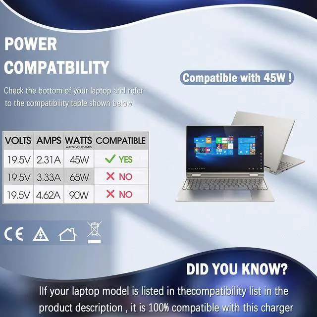 Power Details Output: 45W 19.5V / 2.31A (Fit for 45W 19.5V / 2.31A 4.5 mm* 3.0 mm Blue tip connector);