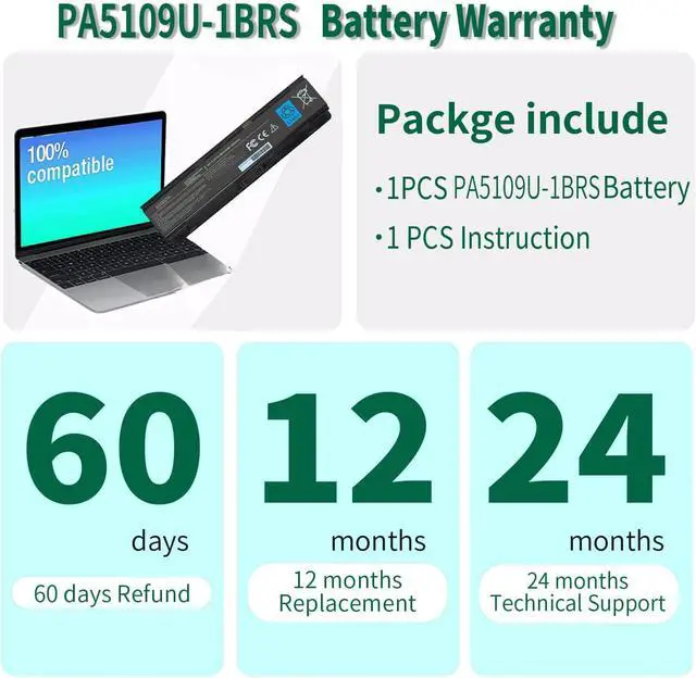 Quality and Certification: Our PA5109U-1BRS Battery is highly compatible with PA5109U-1BRS Toshiba Laptop Battery and meets CE/FCC/ROHS/UL certified standards. It is a brand-new product from the manufacturer and supports up to 1000 recharge cycles.