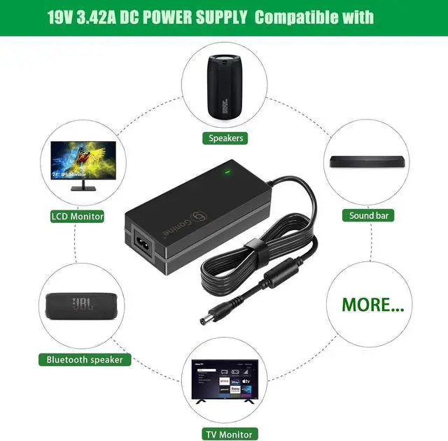 Wide Compatibility & Accurate Output - This 65W max power supply provides stable DC 19V 3.42A output (compatible with 0.1A - 3.42A ). Perfect for 19V Gateway laptop, 19vdc Toshiba laptop, dc19v Acer laptop, 19volt Lenovo Ideapad, 19v Asus laptop, 19v Samsung laptops, 19v JBL Soundbar / Speaker, 19v LG LCD Monitors TV, Netgear Nighthawk WiFi Router, and other 19V devices. (Note: Not for 12V or 24V devices).